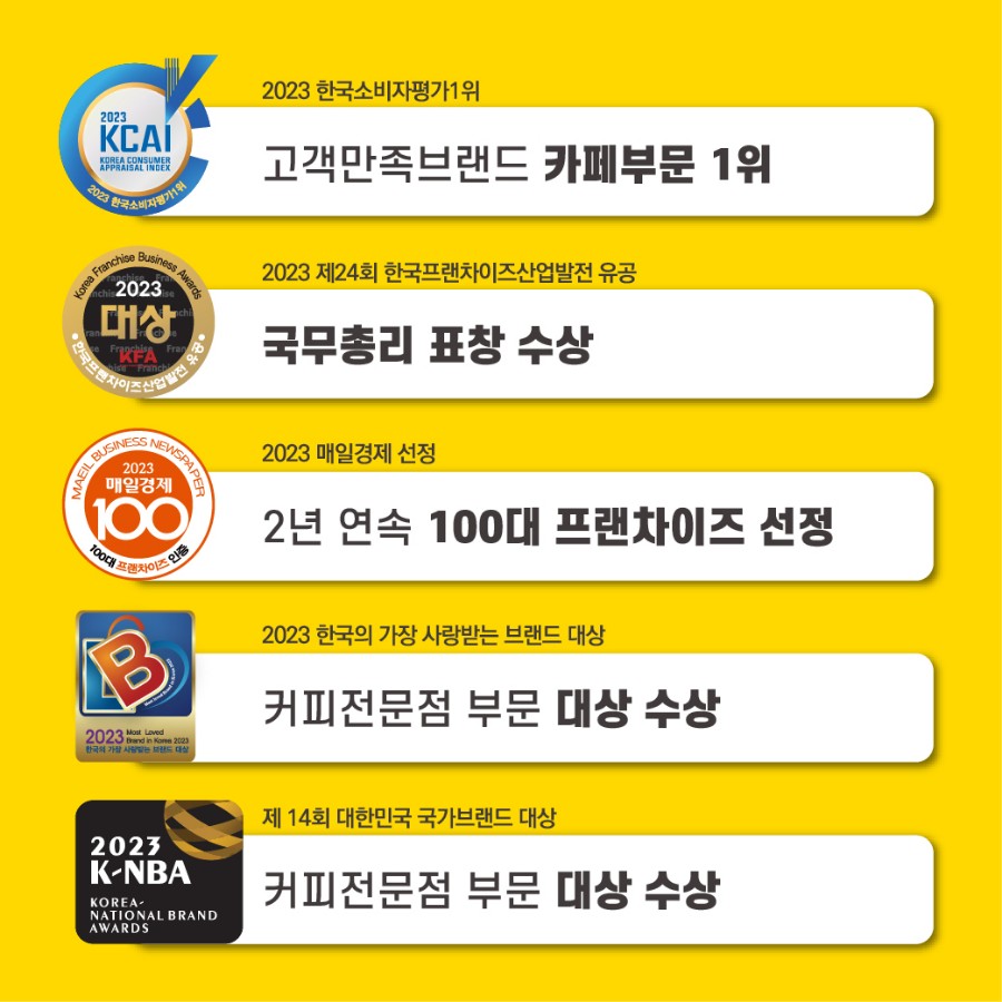 높은 브랜드 인지도를 통해 안정적인 매출을 올릴 수 있지만 창업 비용이 10평 기준으로 1억 3천만 원에 가까운 창업 비용이 발생할 수 있고, 어느 상권에서나 메가커피와의 경쟁은 물론 여타 저가 커피체인점들과 치열한 경쟁을 해야 되기 때문에 철저한 상권 분석을 통해 15평 이상 매장 운영에 자신 있는 분들이 하시는 게 좋을 것으로 보입니다.
